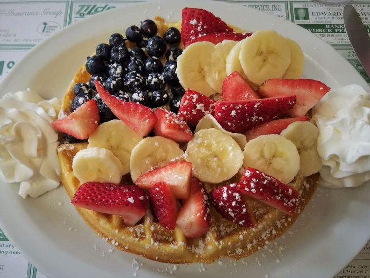 Our extra large Belgian Waffle topped with fresh strawberries, blueberries and bananas, powdered sugar and whipped cream.