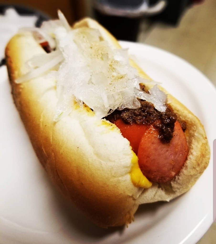 Little Rhody Brand Frankfurts Wieners, cut in house, steamed and topped with the famous meat sauce, mustard, grated onions and celery salt.